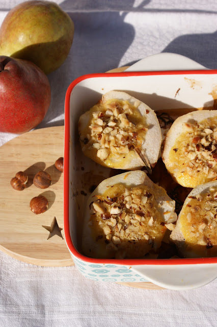 4. Sortez les poires du four. Couvrez les de beurre crémeux à la poudre de noisette, puis parsemez les de noisettes hachées avant de les enfournez 20 minutes. Servez les poires encore tièdes et régalez vous ;)